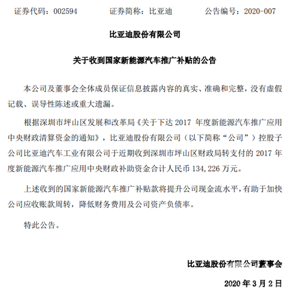 公告|比亚迪获收国家新能源汽车推广补贴13.42亿元