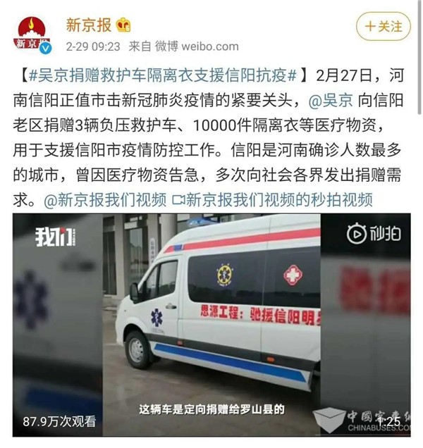 明星吴京向信阳老区捐赠3辆福田图雅诺负压救护车、10000件隔离衣等医疗物资,用于支援信阳市疫情防控工作。