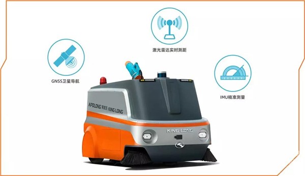 金龙阿波龙GOVO无人驾驶消毒清扫车,具备多传感器融合导航功能,通过激光雷达实时测距、IMU精准测量车体姿态和GNSS卫星导航,自动感应周围环境并智能反应,看得清道路,也绕得过障碍物;转得了弯路,也上得了坡度;看得准垃圾,也不放过病毒;全程无需人员干预,轻松实现清扫和消毒二合一作业。