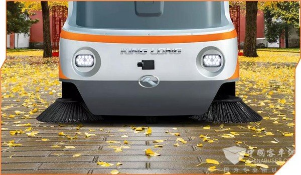 金龙阿波龙GOVO无人驾驶消毒清扫车,在车身左右两侧共有四个自动喷淋降尘系统,降尘、主扫和边扫同步进行,清扫垃圾不留死角。