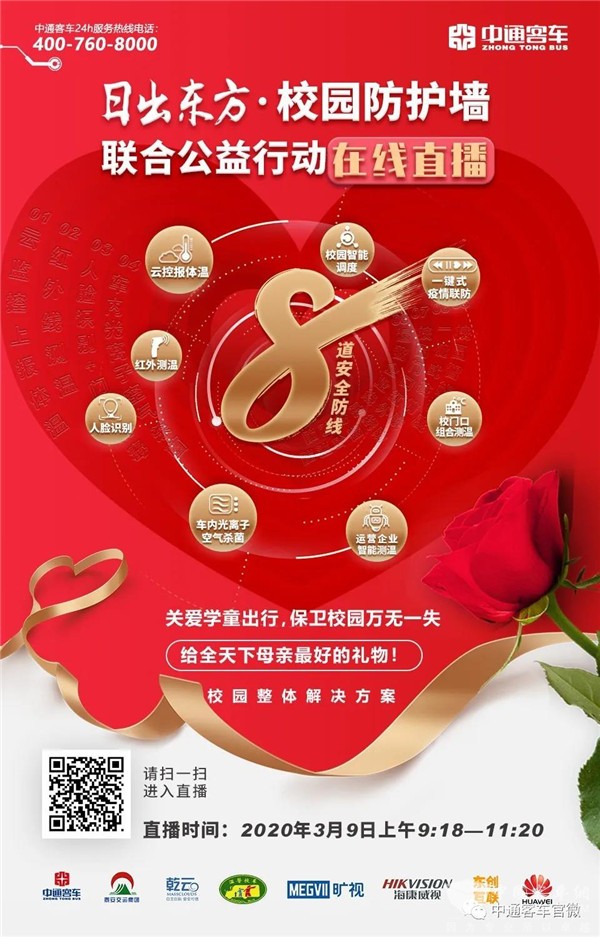 2020年3月9日上午9:18,中通客车“日出东方校园防护墙联合公益行动”云直播即将全面启动。届时,济南、聊城、泰安三地联动直播,中通客车将正式推出日出东方-校园防护墙整体解决方案和行动计划。