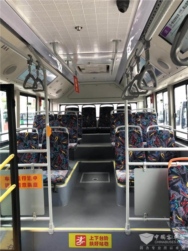 作为苏州金龙第六代大数据智能网联公交,“蔚蓝”Azure从外观上看和传统巴士有很大改变,大V字型前后呼应,银、黑、蓝色的搭配充满了视觉冲击感和未来科技感。车厢内部,漫反射扶手挡板、地铁式不锈钢扶手的设计营造了沉浸式的减压感;车内USB接口、无线下车门铃、ECAS侧跪功能,充分考虑到行走缓慢的老年人。而到了夜晚,精心打造的车内LED氛围灯,更呈现了舒适温馨关怀。另外,乘客舱灭火系统、灭火器等各种装备,也为乘客营造了更安全的出行环境。