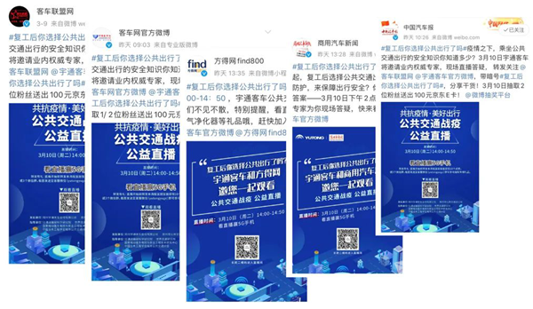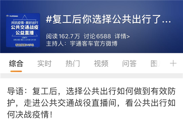 作为宇通客车首场公益直播活动,本次直播引发强烈反响,全场人气爆棚!截至3月11日14:00,直播全网覆盖超过500万人次,在线时长40分钟以上的用户人数超过163万。15家业内权威媒体鼎力发声,实时转播,客车行业人士、公交用户以及广大网友等纷纷发表评论并点赞,宇通创建的微博话题#复工后你选择公共出行了吗#话题讨论量超过160万,尤其是宇通客车推出的多项战“疫”黑科技,以及深澜动力电池等智能化技术的自动监控等功能,深受广大网友好评。