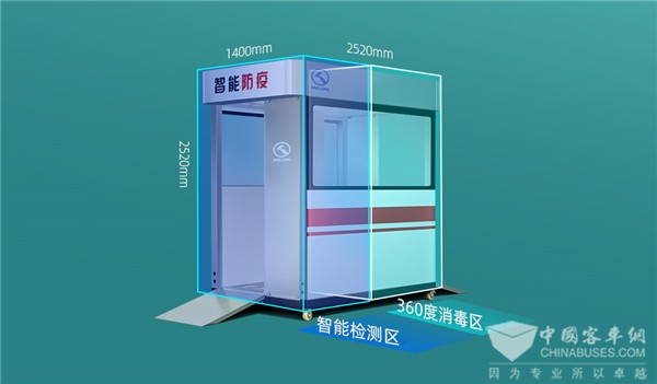 金龙ANMO (Antiepidemic Monitoring Workstation) 智能防疫工作站,是出入口防疫监控综合管理平台,由智能检测区和360度消毒区两大区域组成。