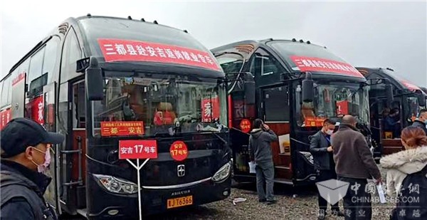 在贵州,10余台亚星客车组成护送返岗专线车队,运送贵州黔南州各县城的务工人员返回浙江安吉等地复工。