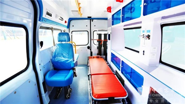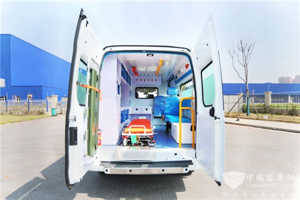 2、采用承载式结构,高钢性底盘一体铸造,并设置单开门和双开门,安全性高、设备齐全、病患转移方便快捷。
