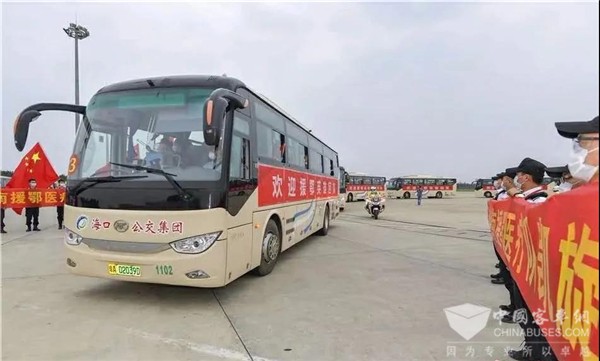 当载着海南医疗队队员的飞机降落海口机场时,翘首以盼的人们热情欢呼,一起向白衣天使们挥手致敬。在机场整装待命的安凯客车已等候多时,与海南人民一起迎接英雄们胜利归来,带着他们平安回家。