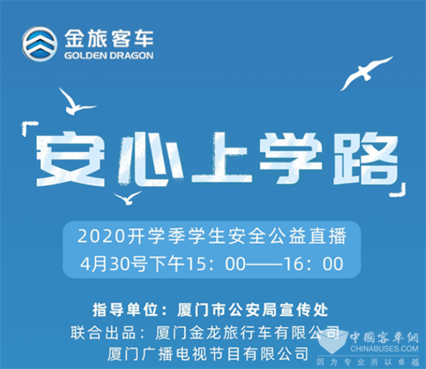 ◎为了帮助学生们调节好心理和学习状态,2020年4月30日下午15:00,厦门金龙旅行车有限公司将携手厦门广播电视节目有限公司,在厦门市公安局宣传处的指导下,推出“安心上学路”——2020开学季学生安全公益直播,为广大学生家长解答居家出行的热点问题。