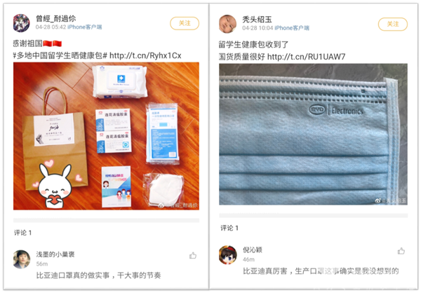 从留学生们收到“健康包”后在网络平台的“晒图”中,一个熟悉的深圳品牌一再出现:比亚迪。