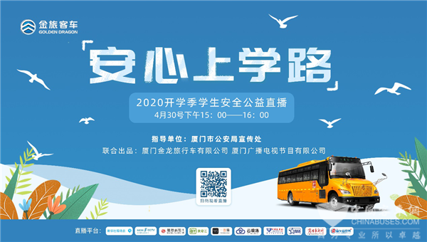 随着我国疫情防控取得阶段性成效,如何安全出行成为学生和家长们最关心的问题。2020年4月30日下午15:00,在厦门市公安局宣传处的指导下,厦门金龙旅行车有限公司携手厦门广播电视节目有限公司联合推出“安心上学路”——2020开学季学生安全公益直播。