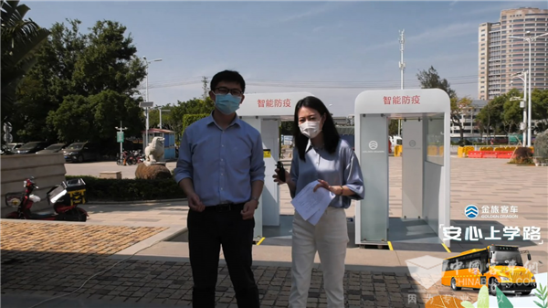 为了全面巩固疫情防控工作,金旅公司发挥所长,用优势技术资源创新生产,针对疫情开发出具有检测、识别、消毒等多功能一体化的防疫工作站,防疫站能够应用于多个场景,如商场、社区、景区、学校等出入口,以此来保障人流密集处的学生公共出行健康与安全。