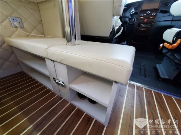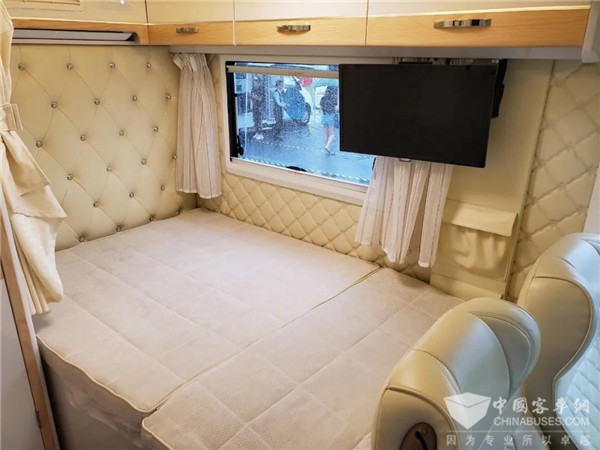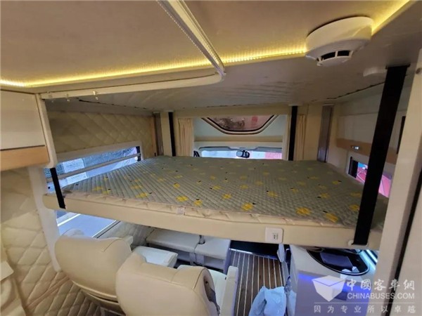 内饰与外观风格很是搭调,同样以白色为主,采用大量白色皮革和饰板,搭配亮黄色灯光,整体风格很清新。床头和侧面厢体均采用软包处理,花纹装饰也不同,可谓档次和舒适兼备。