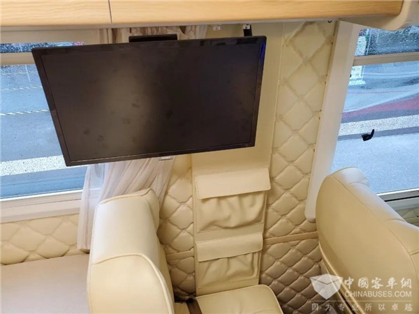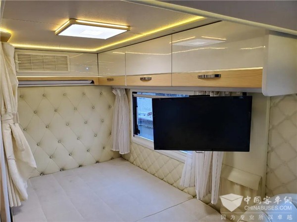 床头上方安装有一台1匹家用静音空调和多个储物吊柜,而空调就隐藏在与储物吊柜同色的装饰中,并不突兀。吊柜下方还有一台24寸车载电视,可调整角度,方便驻车时观看。