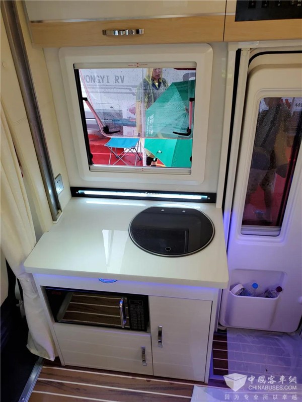 侧门边是厨房区,台面上配备了带盖板洗菜池,再往下还有多个储物柜和一个微波炉。后方配有双门车载冰箱,上下两层,冷藏和冷冻功能都有,容积也很大。