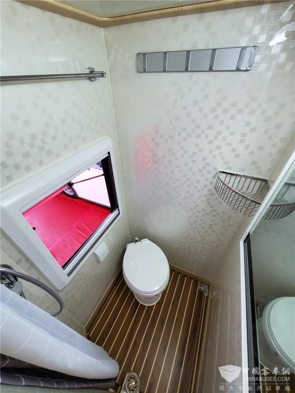 卫浴间配备了固定式洗手池、电动粉碎式座便器、独立淋浴、梳妆镜、衣架及换气扇等,侧面和顶部均装有通风窗和双向风扇。