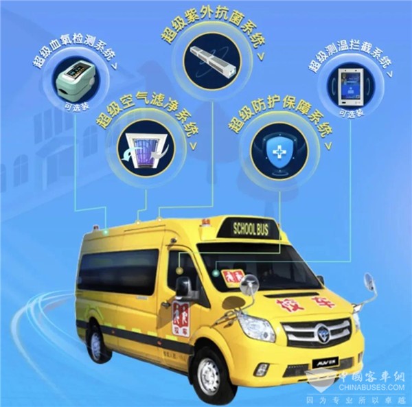 针对疫情防控,福田欧辉特别推出了“超级健康校车”解决方案,加装了超级空气滤净系统、超级紫外抗菌系统、超级防护保障系统等“黑科技”,全方位呵护学童健康。
