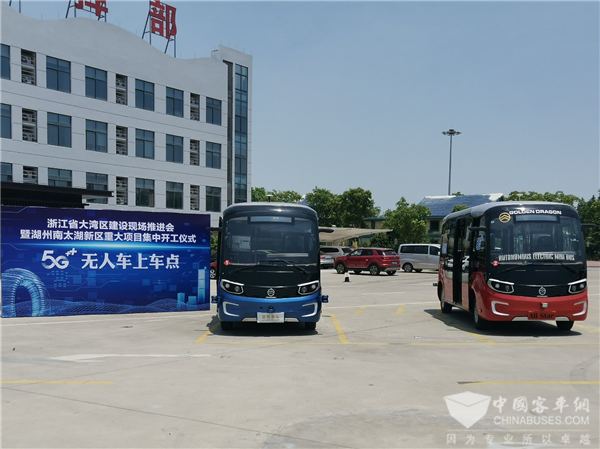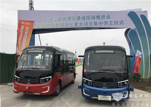 2020年5月22日,浙江省大湾区建设现场推进会在湖州南太湖新区举办,总投资746.7亿元的南太湖新区22个项目集中开工。在本次活动中,金旅L4级自动驾驶客车以自动驾驶模式,平稳安全地将参与开工仪式的领导嘉宾,从工程指挥部接到仪式现场,让智慧城市与智慧交通的美好愿景直观地呈现在人们眼前。
