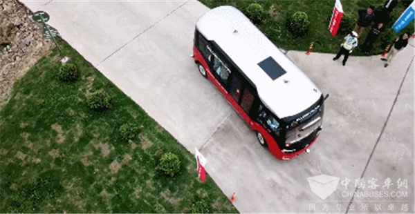 从一段现场活动的航拍视频中我们可以清晰看到,当领导嘉宾登车落座之后,车辆平稳起步,两辆金旅自动驾驶车辆保持一定间距以大约20km/h的车速鱼贯行驶,在通过路口时,车辆主动减速并准确完成转向,最终顺利将各位嘉宾送达仪式现场。整个过程一气呵成,从镜头中很难发现这是两辆无人操作的自动驾驶车辆在工作。