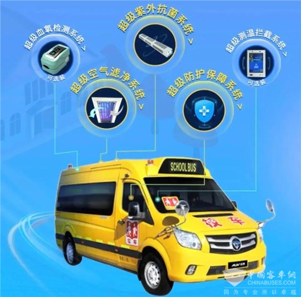 在新型冠状病毒并未彻底消失之前,福田欧辉在校车可选装免洗手消毒液、空气净化天窗、紫外线消毒灯、抑菌座椅面料、无感测温系统的基础上,推出了“超级健康校车”解决方案,加装超级空气滤净系统、超级紫外抗菌系统、超级防护保障系统等,双重保障学生的健康安全,呵护祖国的花朵。