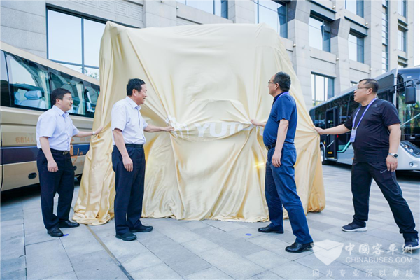 领导们为宇通ZK6820BEV纯电动城郊车揭幕
