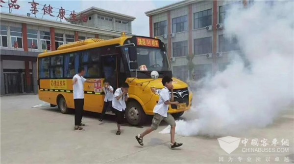 消防演练过程中,福田欧辉专用校车模拟了尾部升起浓烟的突发情况。在浓烟升起的第一时间,看护人员及司机就立即停车、打开车门和安全门,引导学生有序撤离,并使用车辆配备的灭火器进行灭火,预防油箱发生爆炸,造成二次伤害。