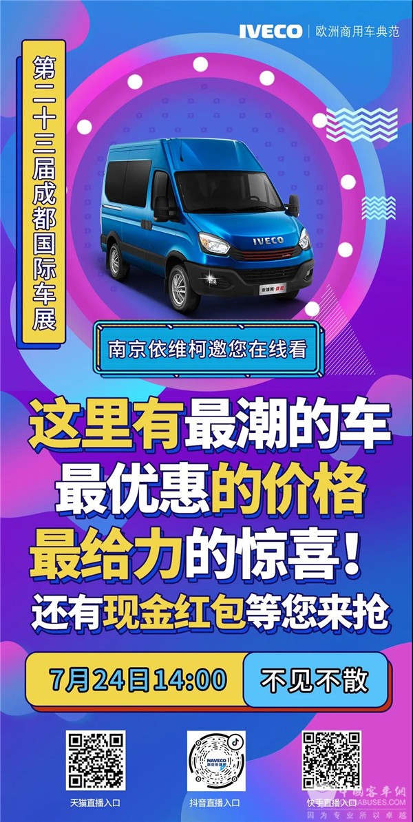 2020年7月24日,第二十三届成都国际车展在成都西部博览城盛大开幕,南京依维柯展台位于14号展馆,在这里,依维柯欧胜8AT、依维柯欧胜2020款、依维柯欧胜宝石蓝30周年纪念款惊艳登场,用非凡的外观与气质,演绎出高端商用车行业的新风尚。