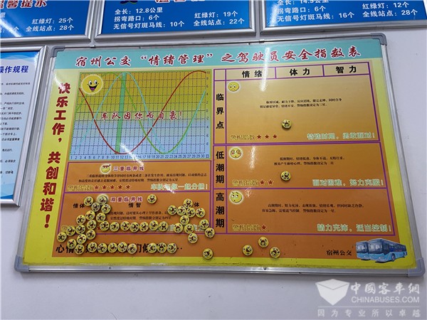 在宿州公交管理中,一个个用心的细节,深藏着管理智慧。记者观察到,在宿州枢纽站设有幸福驿站,方便驾驶员休息;还设有自愿者岗亭,方便路人咨询;最特别的是,调度室墙上挂着一块“‘情绪管理’之驾驶员安全指数表”的磁白板,图表分为情绪“临界点”、“低潮期”、“高潮期”三个区间,方便掌握驾驶员情绪状况,确保行车安全(假若全国公交普及驾驶员情绪管理,贵州安顺公交坠湖事件也许就不会发生了。)