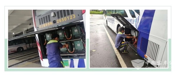台风过后路面积水严重,银隆新能源检修队伍迅速对公交车和充电桩做绝缘检查,避免车辆、充电桩异常导电。