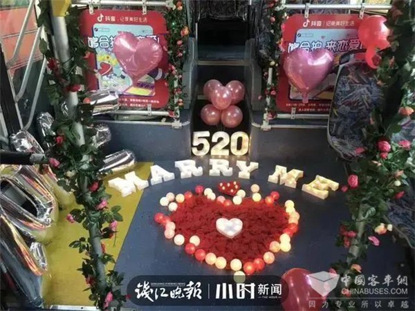 在宋城始发站,这辆停了将近一小时的公交车,透过玻璃窗能够看到浪漫满车的玫瑰和气球,要是再好奇一点,会发现车厢地面上还有爱心花瓣和“520”字样的led灯。