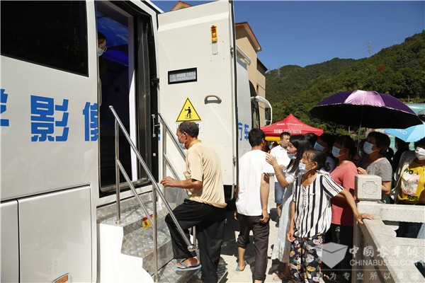 而义诊活动现场,最让老乡们惊喜的,是CT体检车的到来。作为本次活动的支持单位,厦门金龙旅行车有限公司和上海电气康达医疗器械集团股份有限公司,将合作打造的CT医疗车开到了活动现场,把CT检查搬到坑门里村民的家门口,并通过远程会诊系统和移动医疗数字筛查技术,对村民们进行肺癌筛查。