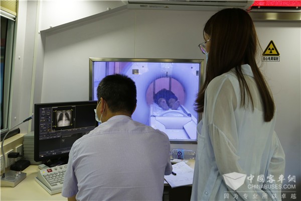 车内布局设有三个舱室,每个舱室都有单独进出通道。驾驶舱在前部,为医护、驾乘人员的乘坐空间,安装了航空级座椅,乘坐舒适性高。中部为检查舱,安装了 CT 机及相关配套设备,检查舱6面布置标准厚度的铅板,同周围空间实现电磁隔离,保证辐射安全。车厢后部是医护人员的操作舱,医护人员可在此进行无接触的常规操作,在安全宽敞的环境中达到与医院机房一样的工作效率。