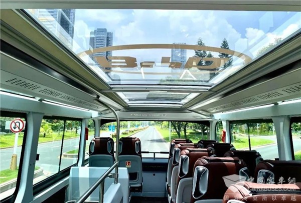 更高颜值、更高品质、更高性能,用心设计打造全新出行,B12D拥有超1.9米高的一层车厢,最大程度给予乘客站立空间;第四代铝合金车身配合一体化玻璃,宽敞明亮,览尽沿途风光。直通式楼梯逐阶而上,一体化护栏、楼梯口防撞软包、冰蓝色踏步灯……带来“居家式体验”,让旅途更加安全舒适;二层超大尺寸全景天窗、折扇式双开遮阳帘、中控防紫外线隔热玻璃、大弧面顶角窗等,尽显人性化关怀,无论穿梭在高楼大厦,还是徜徉在自然风光,都能景入眼帘,给人满目风华, 360°观赏旅途中一道道绚丽多彩的风景,让出行成为一种享受。