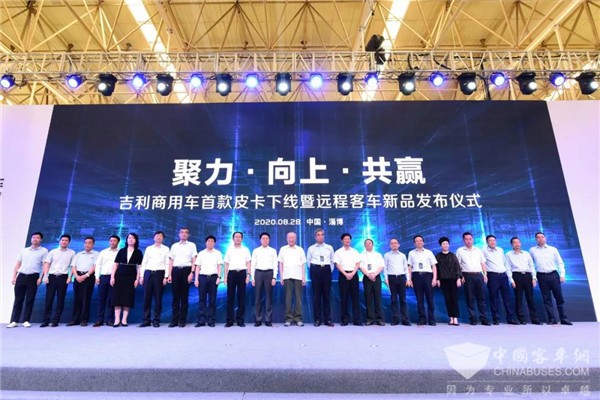2020年8月28日,以“聚力·向上·共赢”为主题的吉利商用车全新产品下线仪式在山东淄博全新基地正式拉开帷幕,活动现场两款重磅车型——首款皮卡以及新款客车首发亮相,充分诠释了吉利商用车在向上道路上的全新实力。