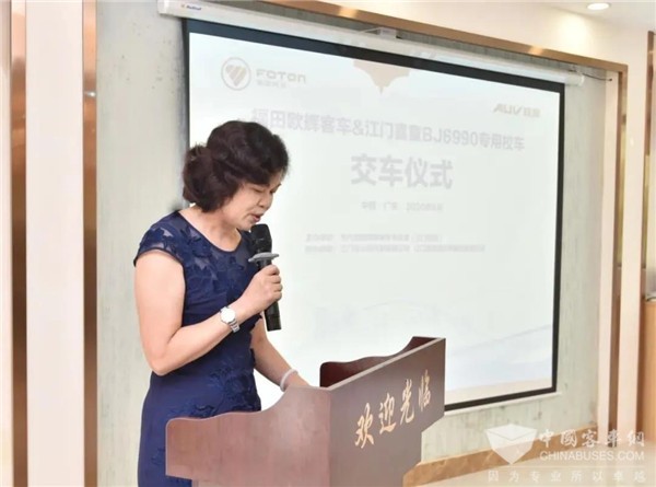 交车仪式现场,江门喜童业务总监刘秀玲作为代表致辞。刘秀玲深入剖析了疫情下校车市场的现状,并对后续江门地区校车的发展方向及采购标准给予了合理化的建议,号召校车企业与福田欧辉加强合作,不断提升品质校车的引进,为江门地区孩童的出行加上安全保障。