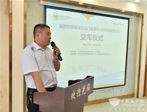 2020年8月29日,福田欧辉&江门喜童BJ6990专用校车交车仪式在广东江门举行。喜童(广东)智慧出行有限公司(简称:江门喜童)业务总监刘秀玲、广东省江门市汽运集团有限公司、江门市公共汽车有限公司等相关领导及福田欧辉营销公司广东销售公司网络支持副总经理仇万里共同出席,交车仪式由福田欧辉客车江门分销公司江门欧冠副总经理郑飞主持。