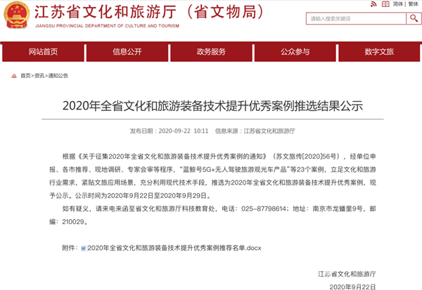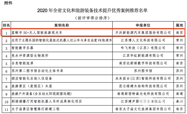 开沃汽车作为江苏省创新型领军企业,以“蓝鲸号”为主体,申报了文旅装备制造创新技术(产品)优秀案例。最终,经市推荐、现地调研、专家会审等程序,“蓝鲸号5G+无人驾驶旅游观光车”产品评审得分第一,被推选为2020年全省文化和旅游装备技术提升优秀案例。