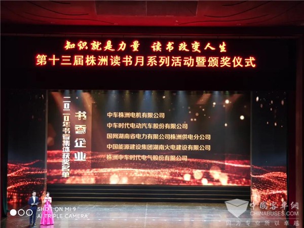 2020年9月29日,以“知识就是力量,阅读改变人生”为主题的第十三届“株洲读书月”系列活动暨颁奖仪式在株洲神农大剧院举行,中车电动喜获“书香企业”荣誉称号。株洲市委副书记、市长阳卫国,市委常委、宣传部长聂方红等领导为受表彰企业授牌。