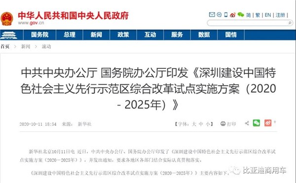 10月11日,中共中央办公厅、国务院办公厅印发了《深圳建设中国特色社会主义先行示范区综合改革试点实施方案(2020-2025年)》,以设立经济特区40周年为契机,在中央改革顶层设计和战略部署下,支持深圳实施综合授权改革试点,是新时代推动深圳改革开放再出发的又一重大举措,是建设中国特色社会主义先行示范区的关键一招,也是创新改革方式方法的全新探索。