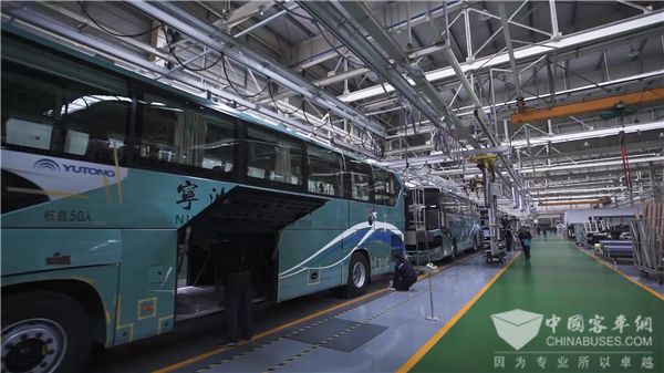 那么,在这样一个世界级新能源生产基地的车间里,组装一台客车需要多长时间?宇通在直播间给出的答案是——2小时!依托高度自动化的技术和模式,19个工位协同合作,宇通承装车间一天可以生产445台客车!