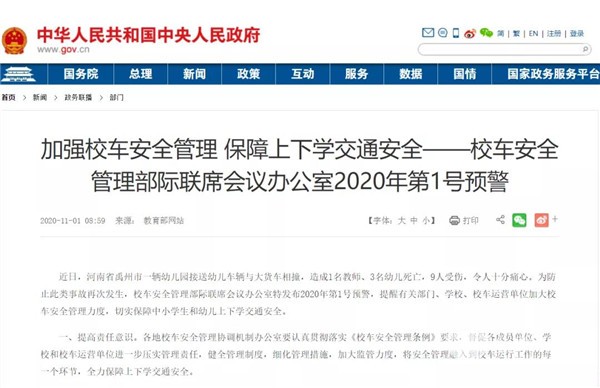 近日,河南省禹州市一辆幼儿园接送车辆与大货车相撞,致使1名教师、3名幼儿死亡,9人受伤,令人痛心。为防止此类事故再次发生,校车安全管理部际联席会议办公室特发布2020年第1号预警,从提高责任意识、加强排查整治、加强宣传教育、把握季节特点四个方面,提醒有关部门、学校、校车运营单位加大校车安全管理力度,切实保障中小学生和幼儿上下学交通安全。