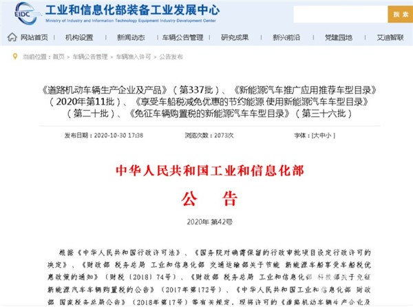 2020年10月30日工信部发布2020年 第42号公告,公告根据《中华人民共和国行政许可法》、《国务院对确需保留的行政审批项目设定行政许可的决定》、《财政部税务总局 工业和信息化部 交通运输部关于节能 新能源车船享受车船税优惠政策的通知》(财税〔2018〕74号)、《财政部 税务总局 工业和信息化部 科技部关于免征新能源汽车车辆购置税的公告》(2017年第172号)、《中华人民共和国工业和信息化部 财政部 国家税务总局公告》(2018年第17号)等有关规定,发布了4个文件,即:1、《道路机动车辆生产企业及产品》(第337批); 2、《新能源汽车推广应用推荐车型目录》(2020年第11批);3、《享受车船税减免优惠的节约能源 使用新能源汽车车型目录》(第二十批);4、《免征车辆购置税的新能源汽车车型目录》(第三十六批)。