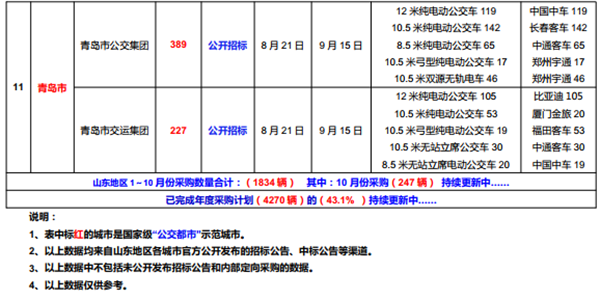 作为国家级“公交都市”示范城市,青岛市一直以来是山东省公交客车招标采购的大户,几年来随着新能源公交客车的普及,当地政府也在不断释放出加快新能源公交客车更新换代落地的信号,青岛市公交集团及青岛市交运集团于今年9月15日发布了389台及227台公交客车招标结果,经过激烈的角逐,最终,这两笔批量大单被中车电动、中通客车、宇通客车、比亚迪、金旅客车、福田欧辉等车企摘得。值得一提的是,青岛市这两批订单也是山东地区1-10月公交客车招标采购的数量最大的批量订单。