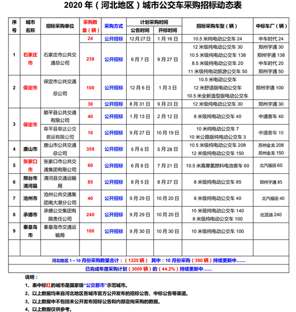招标研究:2020年1—10月河北地区公交客车招标汇总参考