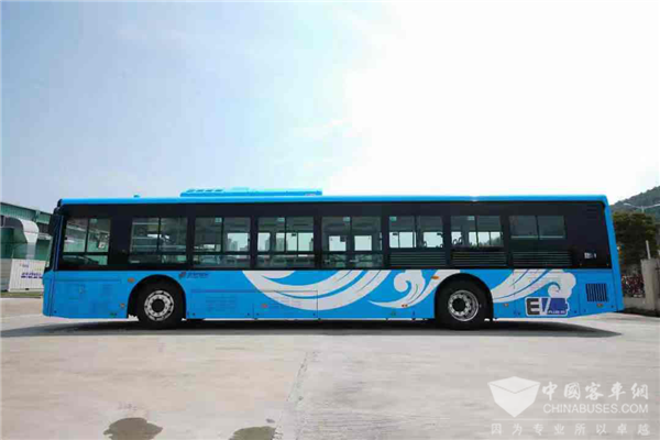 最经典的方正造型,蓝色的基调铺满了整车,车身点缀了几朵祥云,象征绿色城市里的蓝天白云;前后围组合灯充满科技感,曲面大视野前档玻璃全方位保证司机的前方视野,后围大透明区后档玻璃增加车厢内透光性,座椅设计复核人体工程学,乘客座椅间距设计远高于国标,使乘坐更舒适、通行更方便。