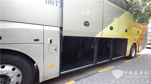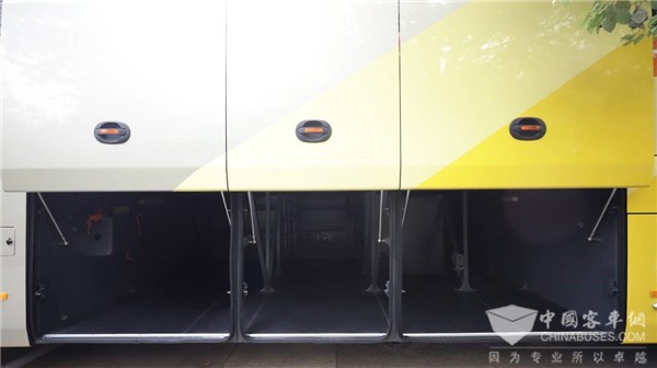 行李舱开关门的形式和我们常见的有些不同,常见的大巴车上都是气动开关门,而旅行家则采用了电动平移行李舱门。取消了气动装置、减轻了车门的重量,车门还带有电吸功能,关门后行李舱部位更加平整,密封性也大有提高。