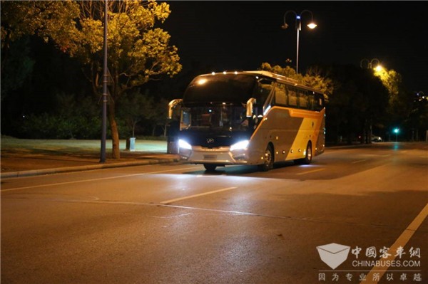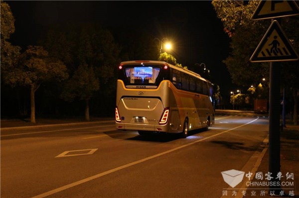 其实海格旅行家的亮点在晚上更多,我们接下来将场景转换到夜晚。到了晚上,海格旅行家打开了车灯。灯光非常的明亮,用户不用担心能耗过高需要频繁更换灯泡,旅行家采用了低能耗高亮度的LED车灯技术,既提高了亮度也提高了零件的寿命。