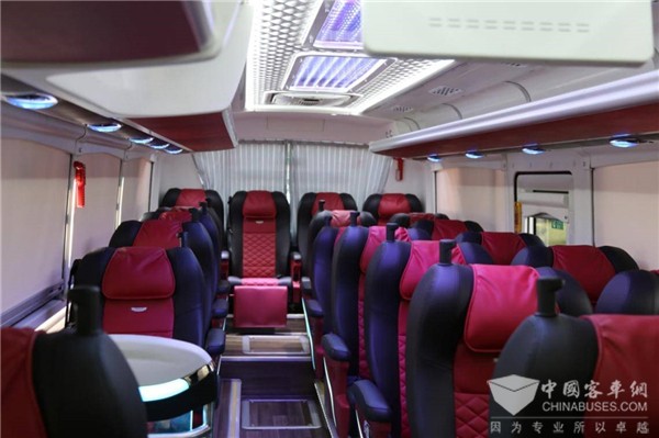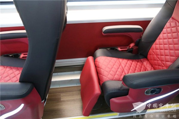 车厢内部采用了右1左2的座椅布置形式,所有座椅均采用了酒红与雅黑双拼的高端软座。座椅左右两边均设置了扶手,前部还设置了脚托,可以根据乘客的需求来进行角度调节。