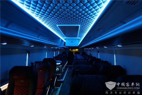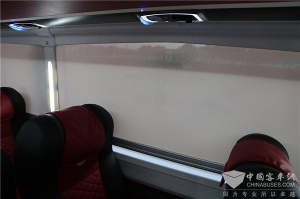 座位顶部的设计借鉴了飞机上的理念,空调出风口可独立开合并且切换角度,这块面板还有两个带有独立开关的阅读灯。乘客区域可以享受到非常丰富的功能,即使面对长时间的长途旅行也能够得到良好的乘车体验。
