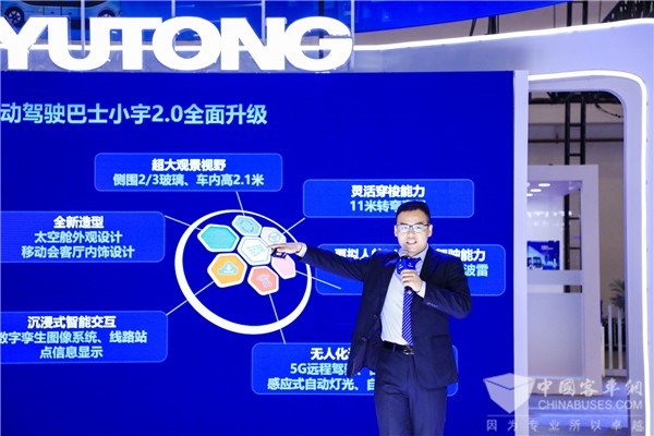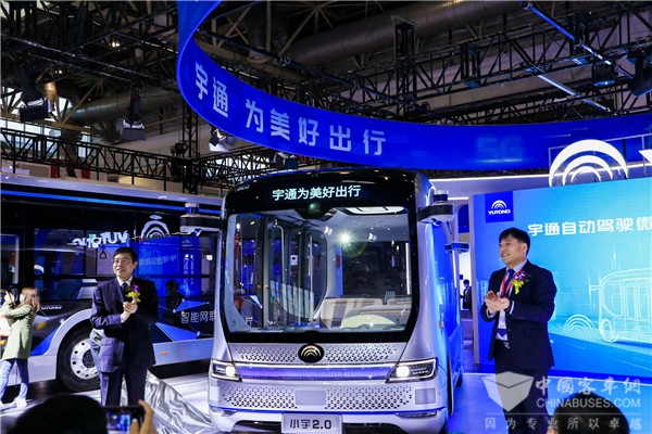 展会现场,宇通全新造型的L4级自动驾驶巴士小宇2.0版隆重发布。