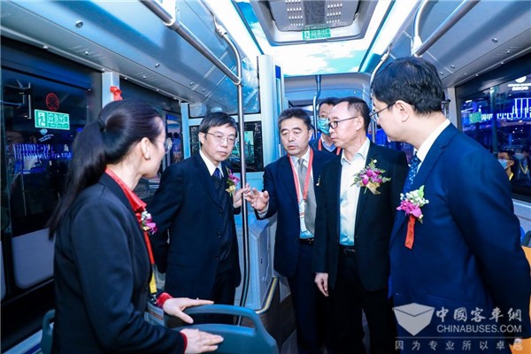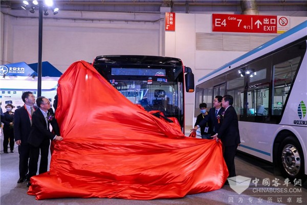 交通运输部科学研究院党委书记、副院长周晓航,中国公路车辆机械有限公司总经理、党委副书记宋金刚,中国公路车辆机械有限公司副总经理、中国公路学会客车分会秘书长胡选儒,北京北方华德尼奥普兰客车股份有限公司董事长赵东旭共同为“火凤凰”揭幕